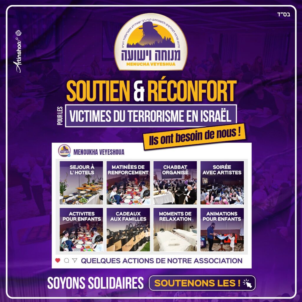 Face à cette tragédie, l’association Menou’ha VeYeeshou’a s’est mobilisée pour être une lueur d’espoir. Notre mission : offrir à ces familles endeuillées ou déplacées un moment de répit, un soutien pour se reconstruire, et l’espoir d’un avenir meilleur.