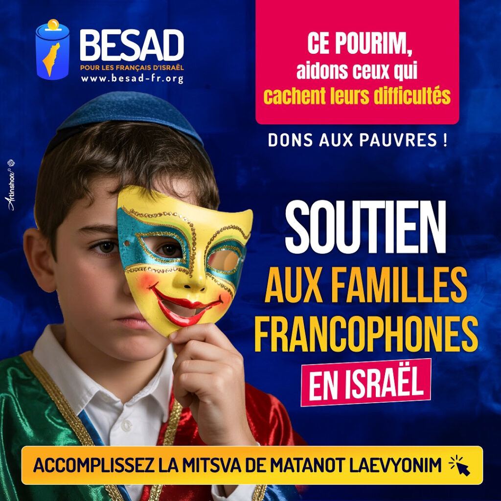 Aujourd’hui, à travers l’association BESAD – La Caisse des Français d’Israël, vous avez la possibilité d’accomplir cette Mitsva tout en aidant concrètement des familles françaises en grande difficulté en Israël.